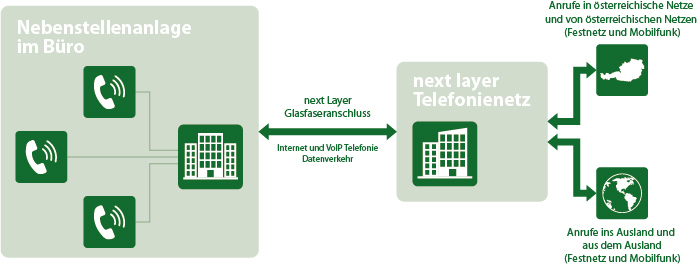 Die Telefone im Büro verbinden sich mit der Nebenstellenanlage. Die Gespräche werden dann von dieser über die next layer Glasfaseranbindung and das next layer Telefonienetz geleitet. Von dort erfolgt die Verbindung zu anderen Telekommunikationsanbietern – national wie auch international. Wird man angerufen, erfolgt der Aufbau des Gesprächs genau in umgekehrter Reihenfolge.