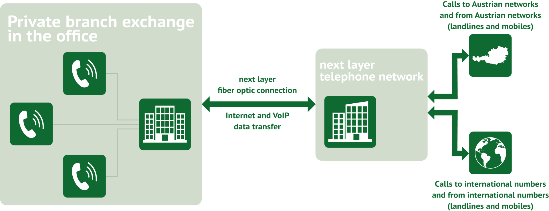 The office telephones connect to the PBX. From there, the calls are routed via the next layer fiber optic connection to the next layer telephone network. From this network, you can connect to other telecommunications providers, both locally and worldwide. Calls are connected in reverse order when you receive them.