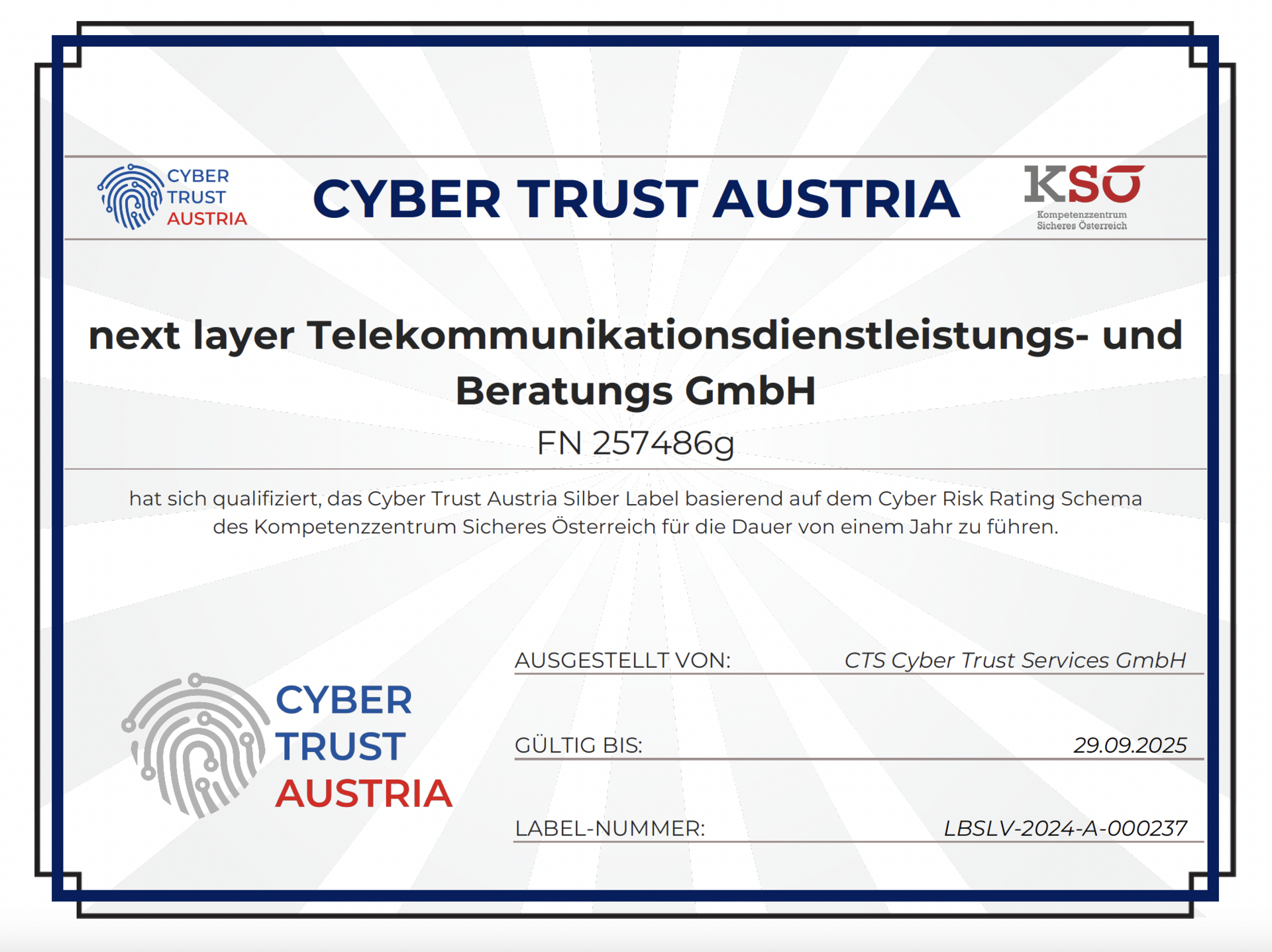We are proud holders of the Cyber Trust Austria Silver Label, which is based on the Cyber Risk Rating Scheme designed by the Kompetenzzentrum Sicheres Österreich (Austrian Security Board). This award reinforces our commitment to ensuring the security of your data is always our top priority.