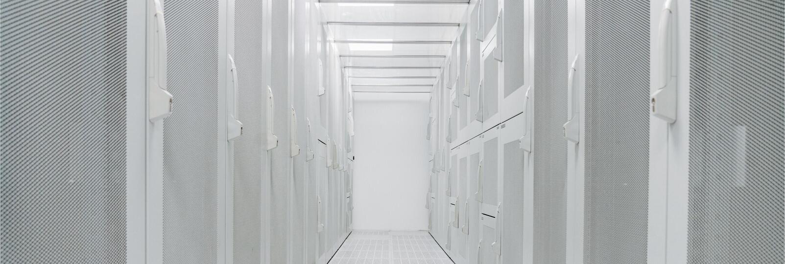 - Die Luft-Temperatur im Kaltgang wird gemäß ASHRAE 2021 Class A1 zwischen 15 und 32 Grad geregelt, die relative Luftfeuchtigkeit auf 8% bis 80%